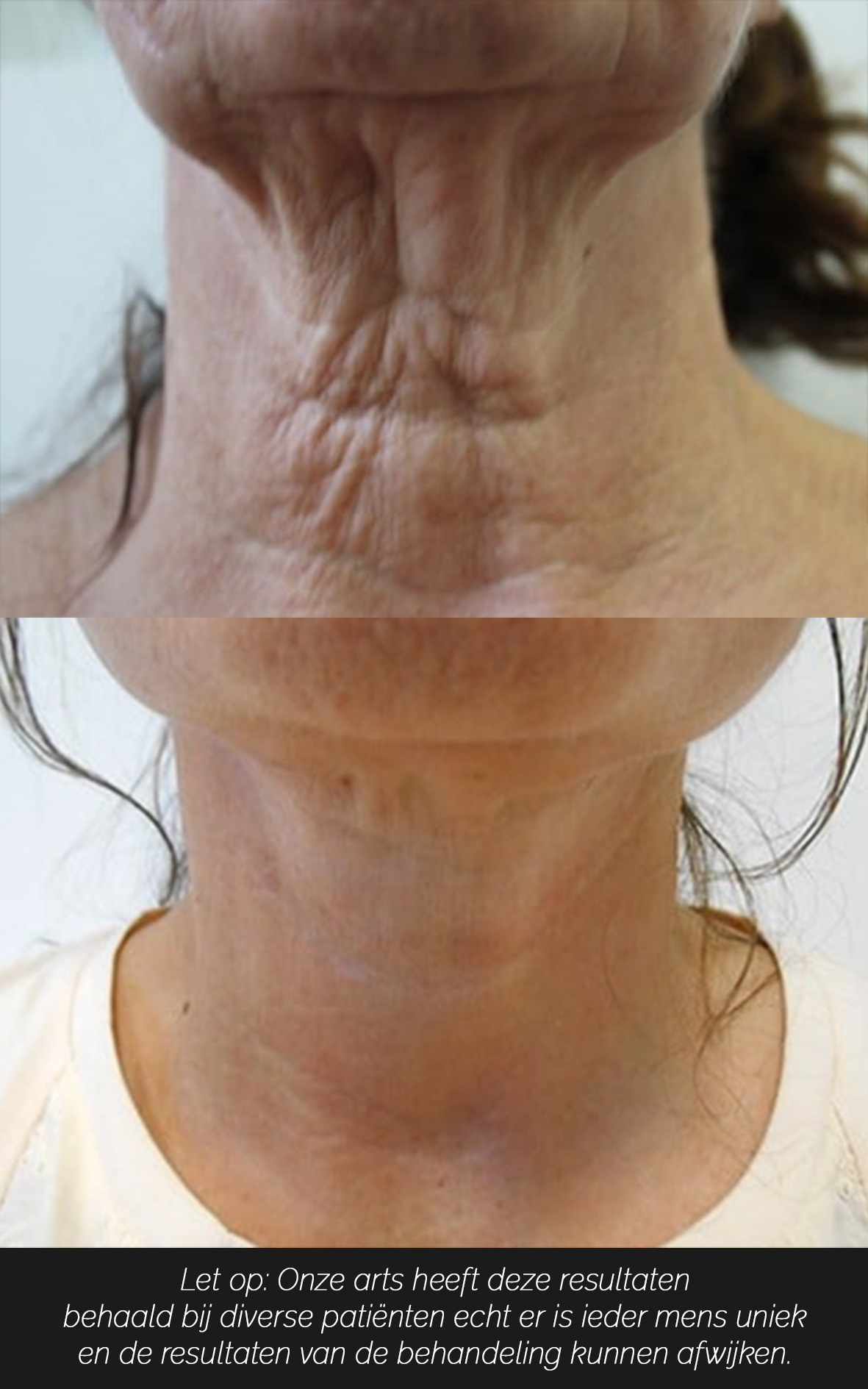Welke specifieke behandeling of combinatie van behandelingen bij u nodig zijn hangt af van de resultaten waar u naar op zoek bent en van de ernst van uw huid- en of spierveroudering. Dr. Don zal tijdens de intake goed uitleggen waarom hij u een complete halslift adviseert maar ook waarom het misschien niet nodig is. Tenslotte moet de behandeling passen bij uw verwachtingen.